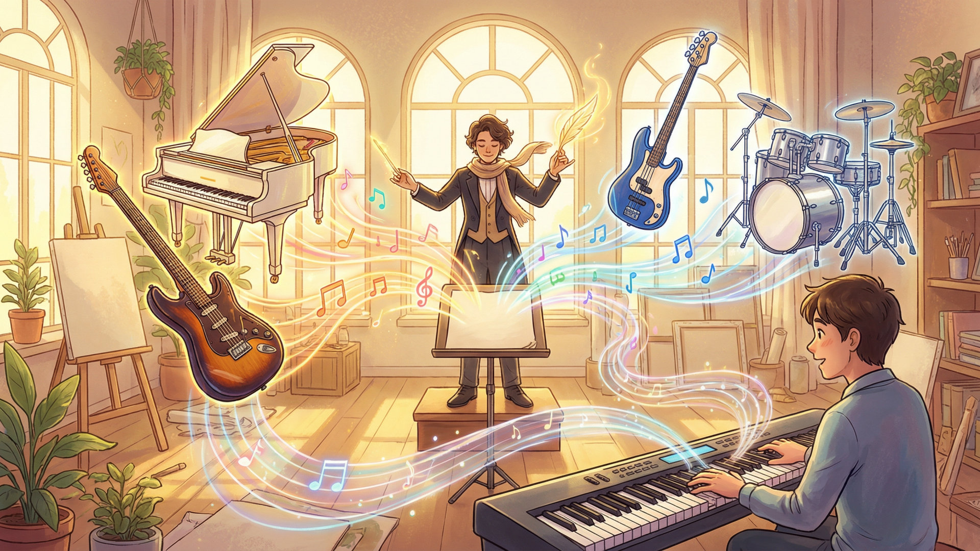 La IA genera acordes, batería, bajo y guitarra para complementar tu melodía.
