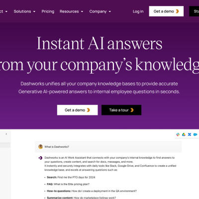 Dashworks는 개인의 생산성을 향상시키고 팀의 워크플로를 자동화하도록 설계된 고급 지식 도우미입니다. 지능형 기능을 갖춘 Dashworks는 정확한 정보를 신속하게 찾아주고 모든 비즈니스 애플리케이션에서 프로세스를 간소화하는 데 도움을 줍니다.