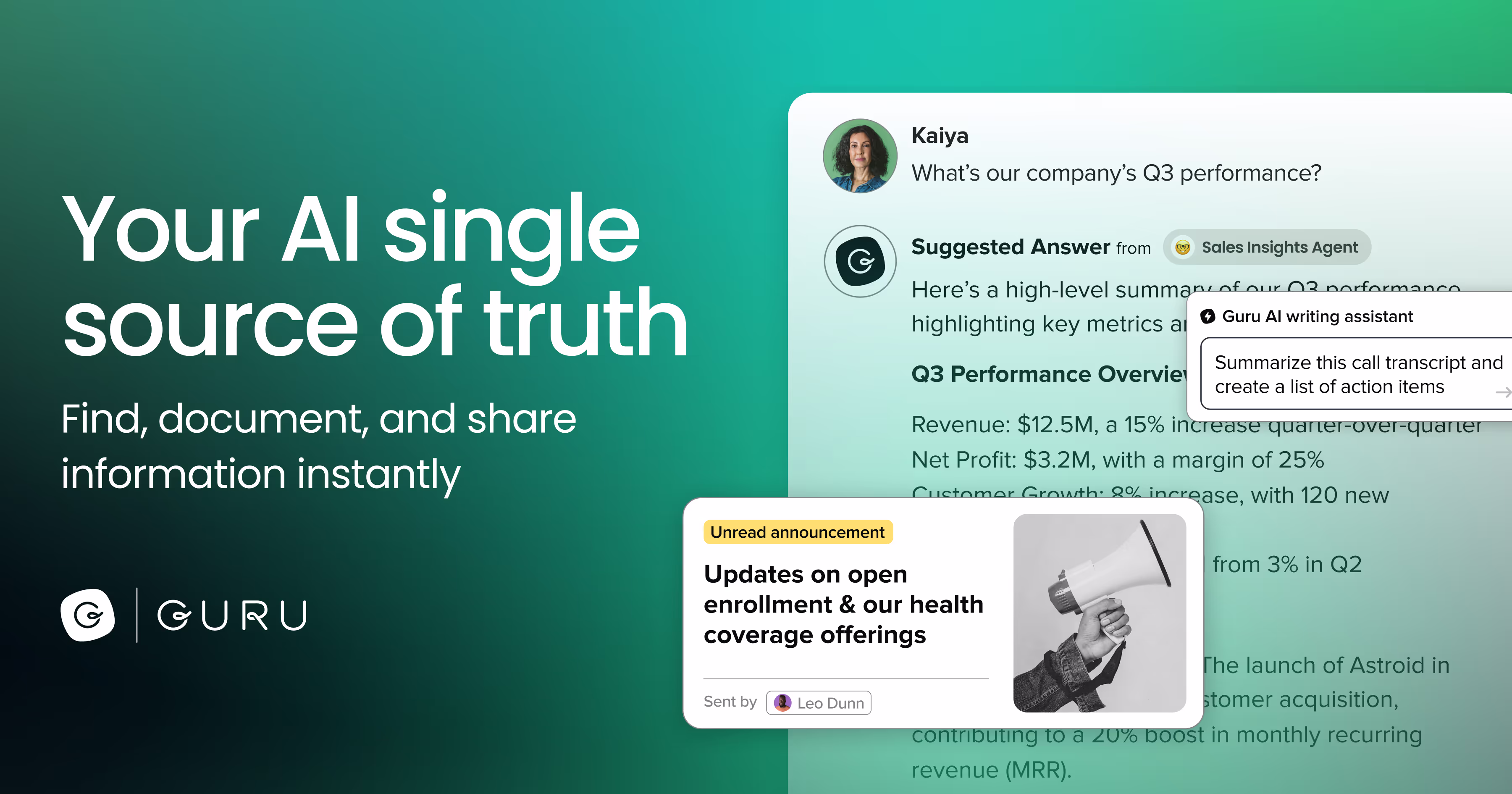 Guru AI는 팀이 다양한 애플리케이션에서 검증된 정보에 즉각적으로 접근할 수 있도록 도와주며, 워크플로우를 관리하고 자동화할 수 있는 지식 보조 도구입니다.