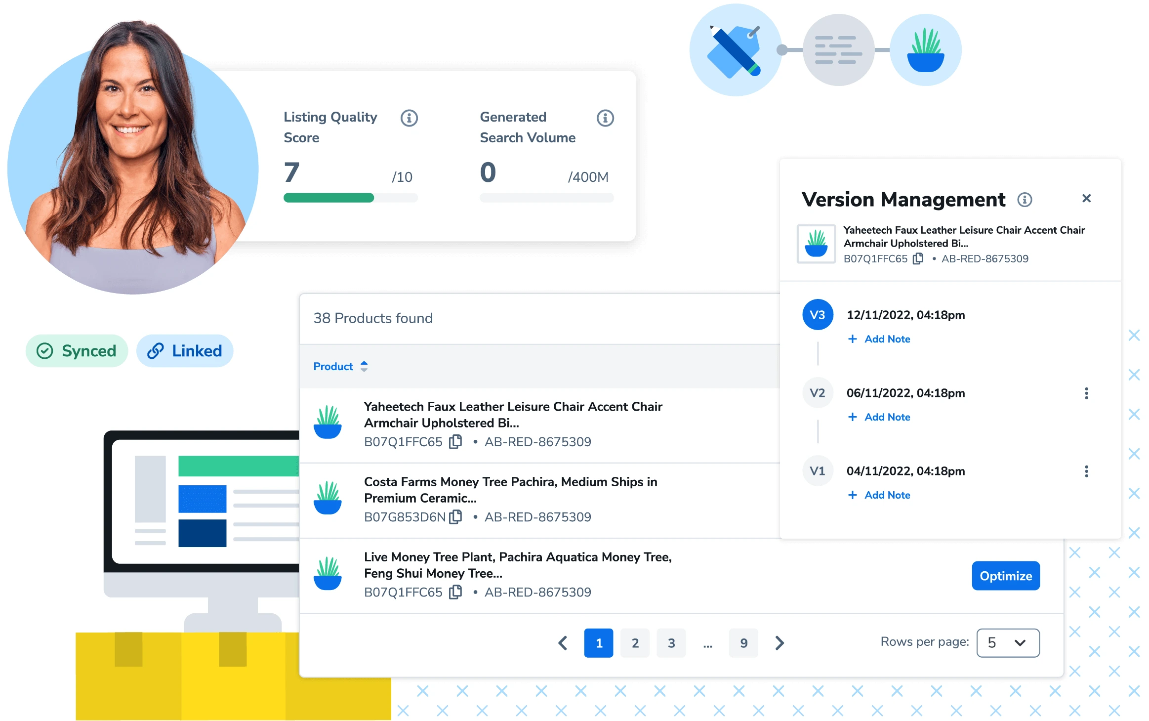 Интеграция с Amazon Seller Central обеспечивает бесперебойную синхронизацию оптимизированных листингов. Управляйте и улучшайте свой контент непосредственно из инструмента, гарантируя, что ваши активные листинги всегда актуальны и хорошо оптимизированы.